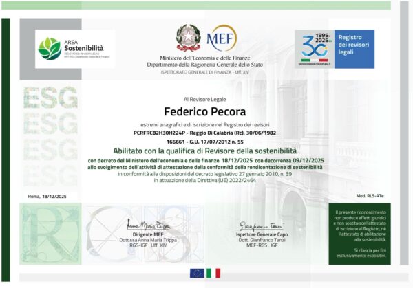In un contesto di profondi cambiamenti legati ai principi dell’economia equa e sostenibile, a cui anche le imprese sono chiamate ad adeguarsi attraverso l’adozione di pratiche ESG per contribuire a un futuro migliore, la nostra società ConsultINT & Partners Srl e tutto il Consiglio di Amministrazione si congratulano con il socio Federico Pecora per il prestigioso riconoscimento ottenuto.